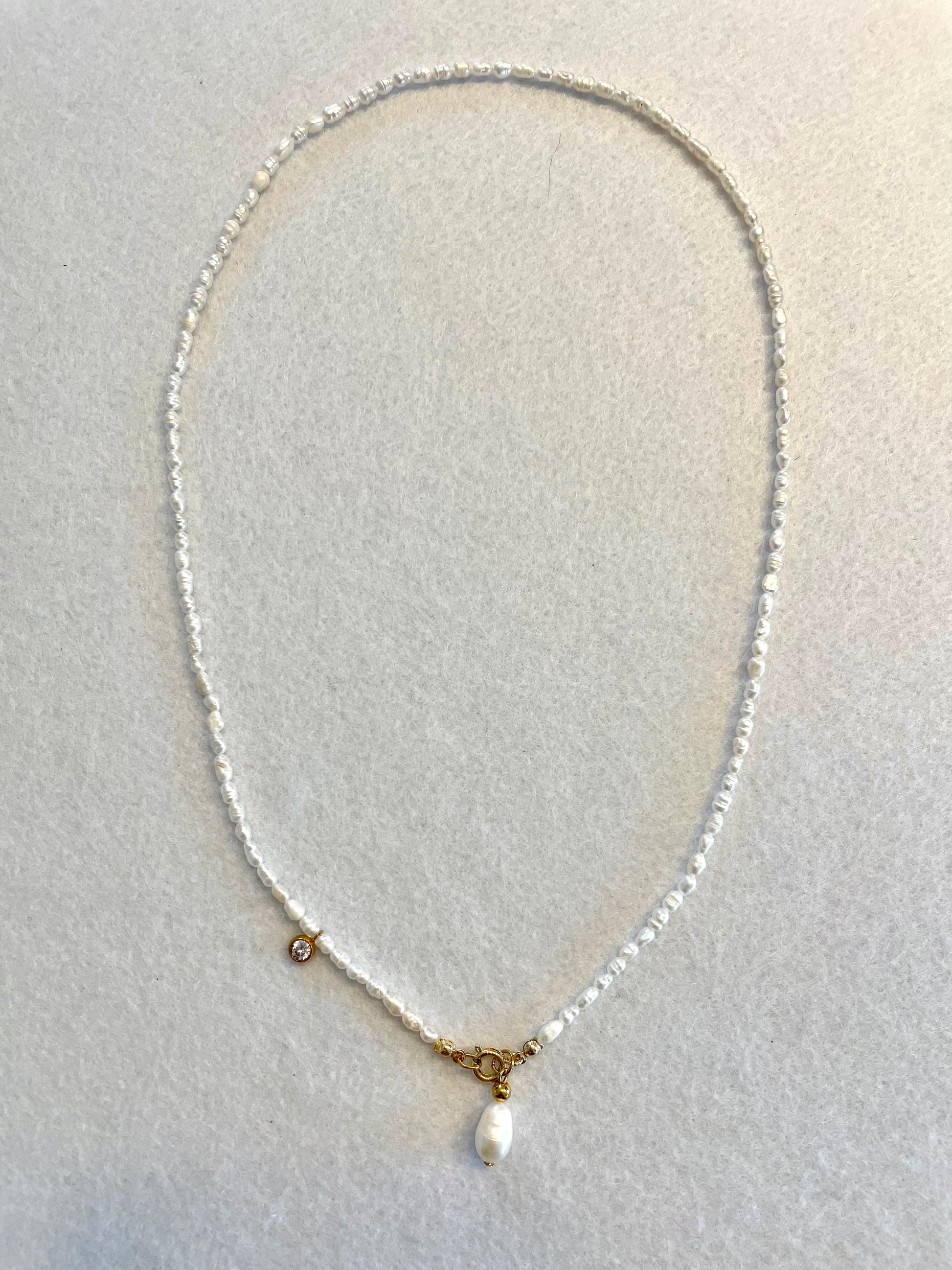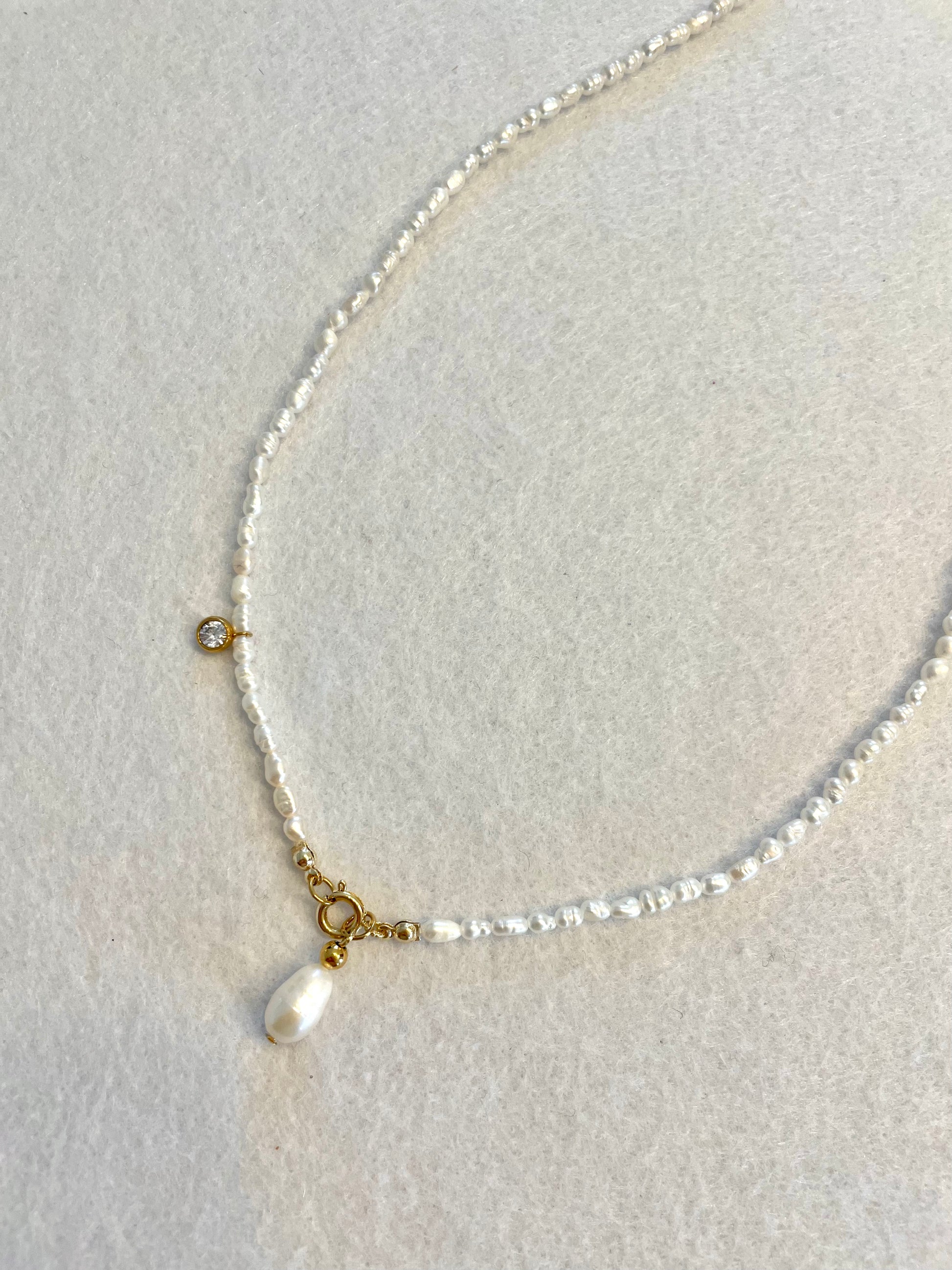 Diese elegante Halskette aus hochwertigen Süßwasserperlen wird durch einen Anhänger aus einer einzelnen Süßwasserperle veredelt. Die harmonische Kombination der Perlen und das schlichte, aber edle Design machen diese Kette zu einem vielseitigen Schmuckstück, das perfekt für besondere Anlässe und den Alltag geeignet ist. Erhältlich in verschiedenen Längen.